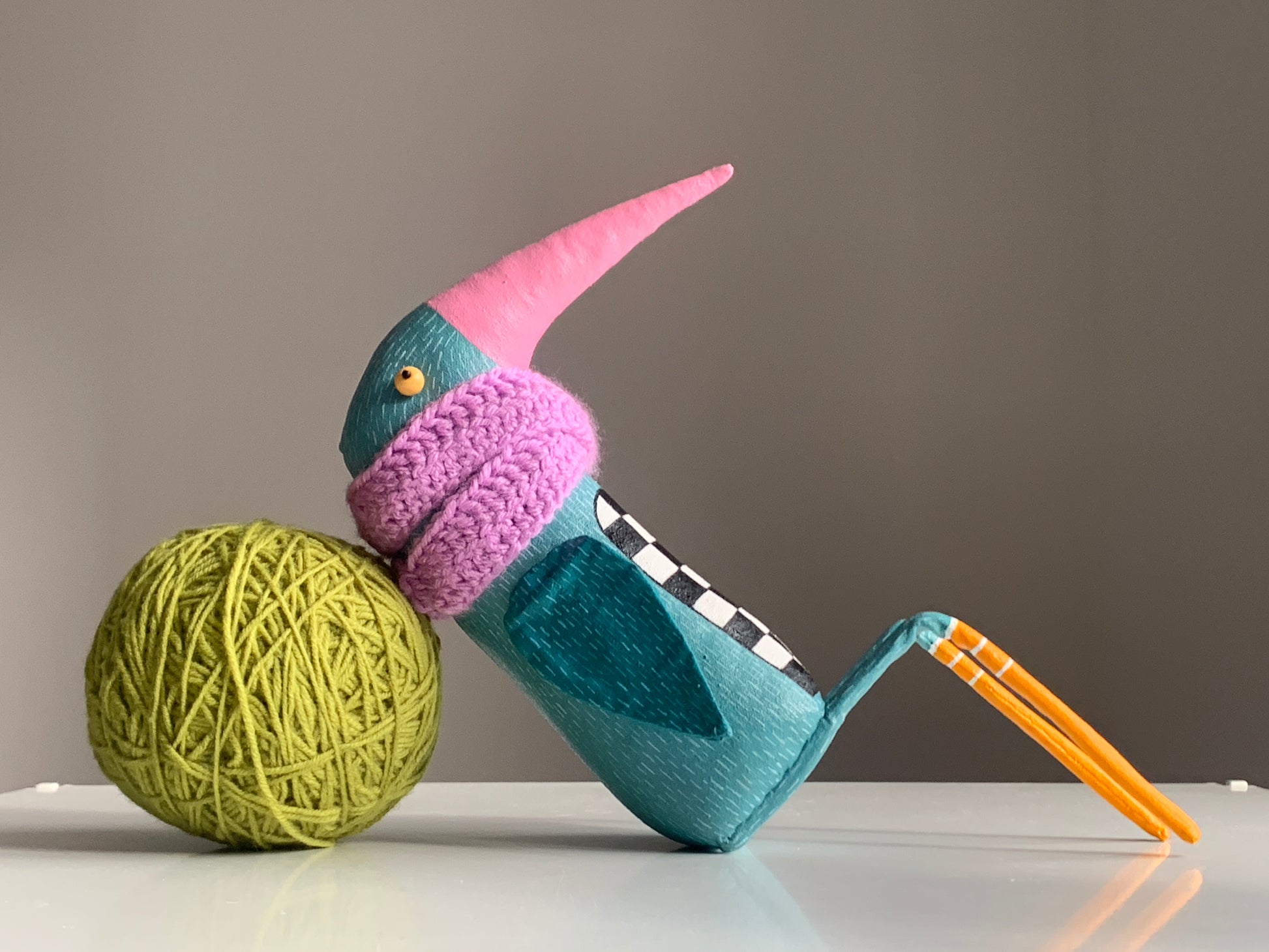 Handmade interior toy Bird in the violet scarf . Painted textile soft sculpture for home decor. Doll for kids room
