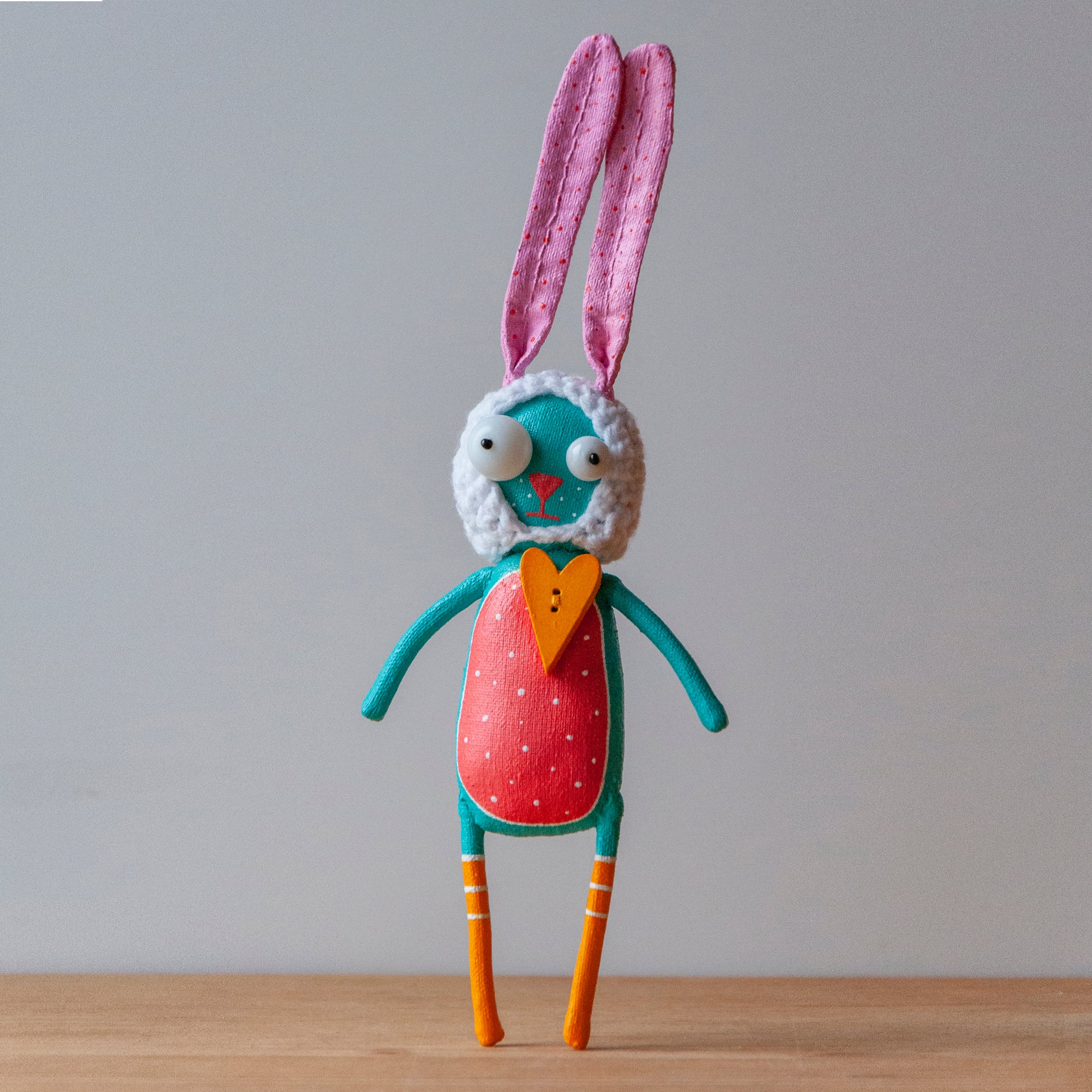 Nora the bunny can come with her own wooden stand (not shown in the pictures, but I can make one!) — so she can stand safely anywhere and bring you quiet joy.