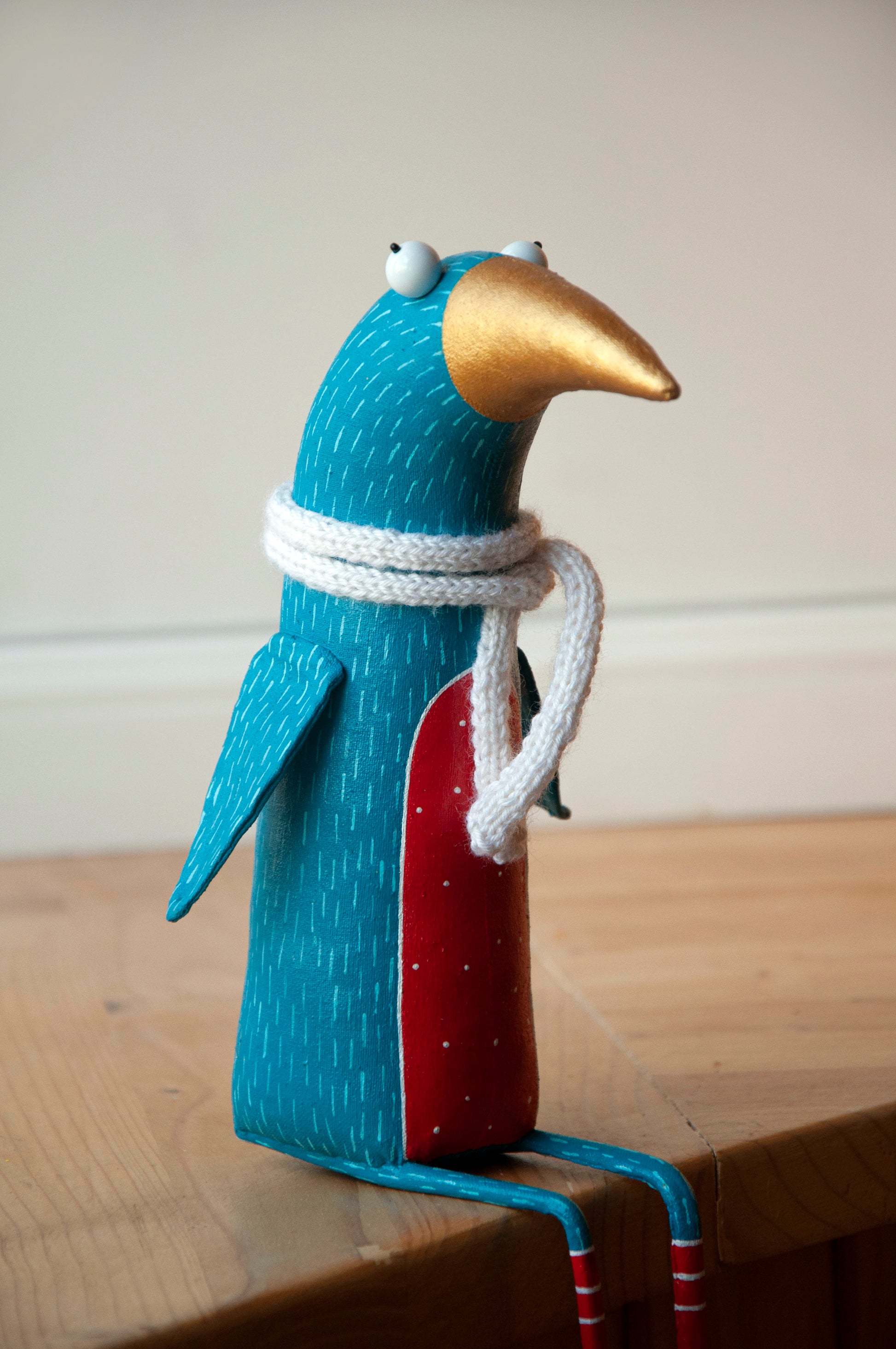 Handmade interior toy Dreaming Seagull. Painted textile soft sculpture for home decor.